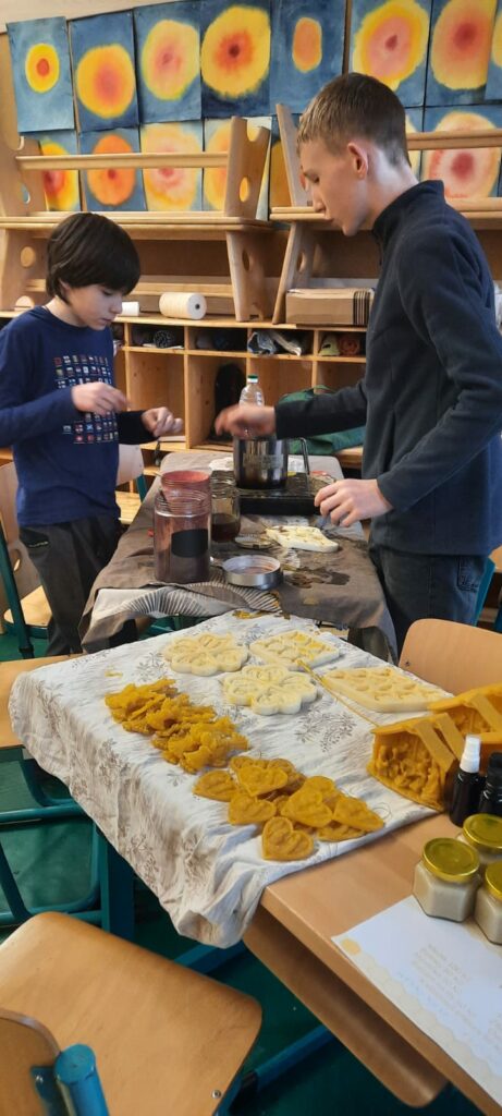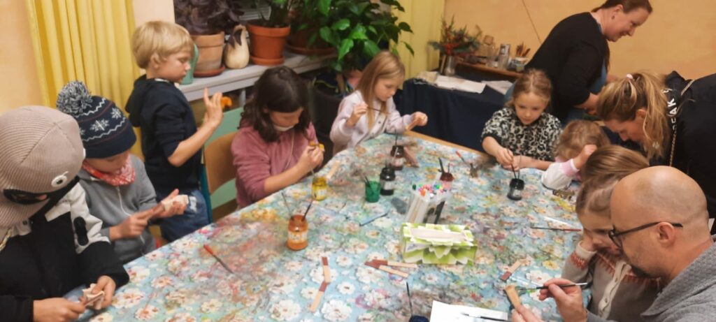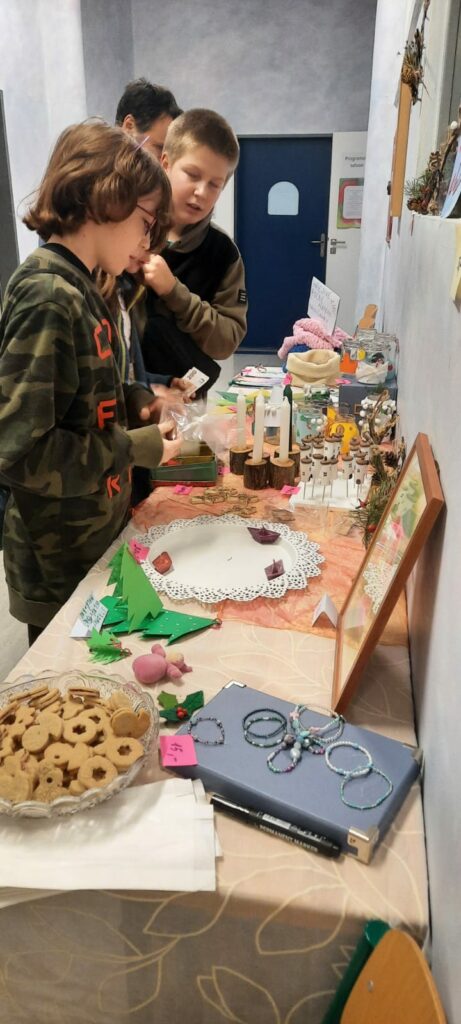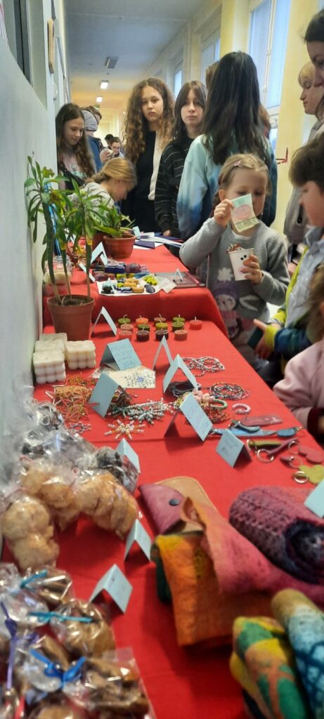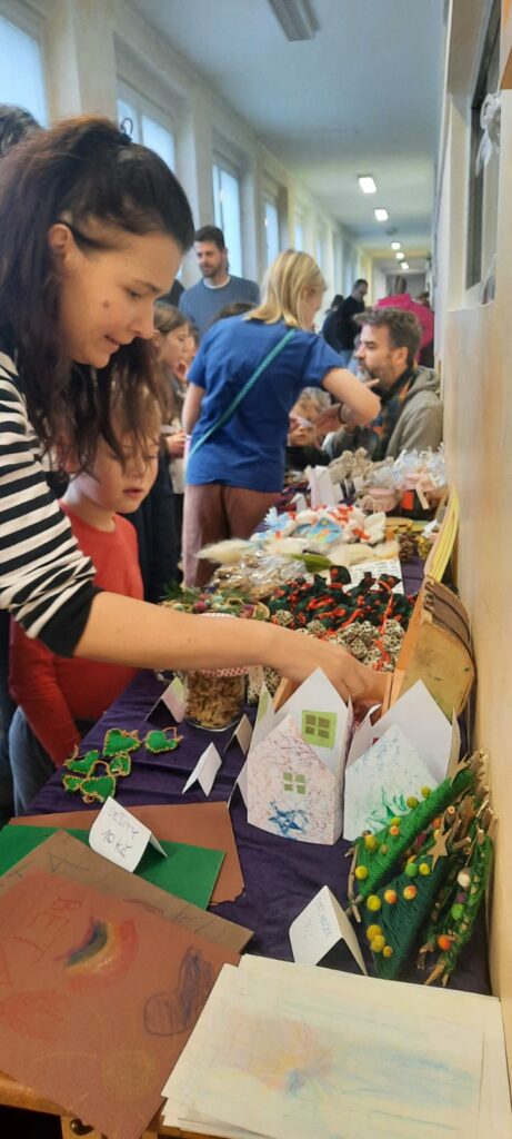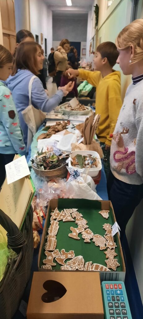 Letošní jarmark byl poprvé na Vlastině. A protože prostory jsou menší než na Dědině, rozprostřel se doslova do všech koutů. Třídy, chodby i zahrada byly plné stánků. Děti z jednotlivých tříd v nich prodávaly své výrobky a vánoční dekorace.
