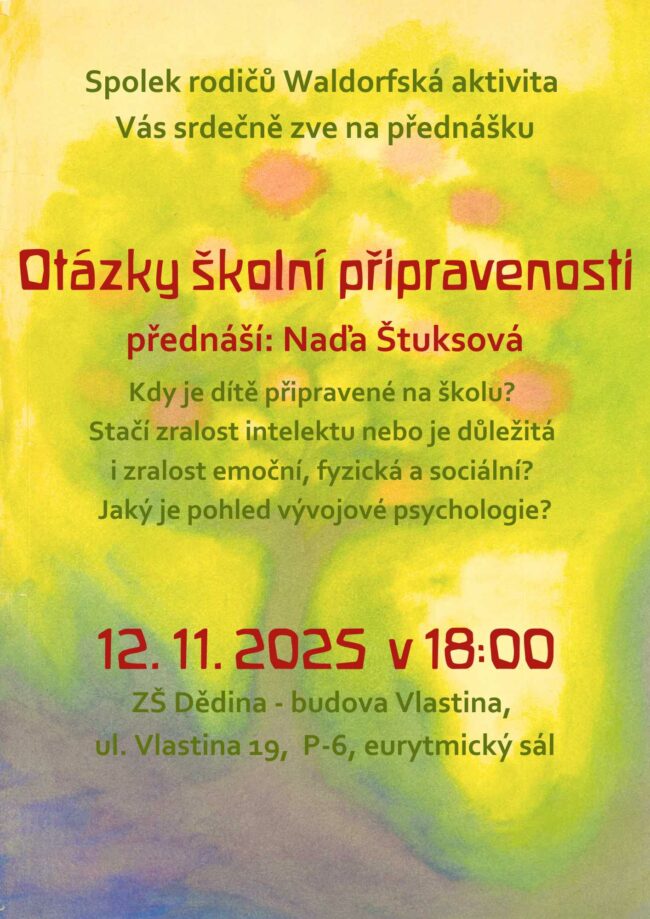 Milí rodiče budoucích prvňáčků, srdečně vás zveme na předzápisovou přednášku a besedu. Dozvíte se, jak probíhá výuka na naší waldorfské škole, proč se věnujeme komplexnímu rozvoji osobnosti dítěte, ... Číst dál