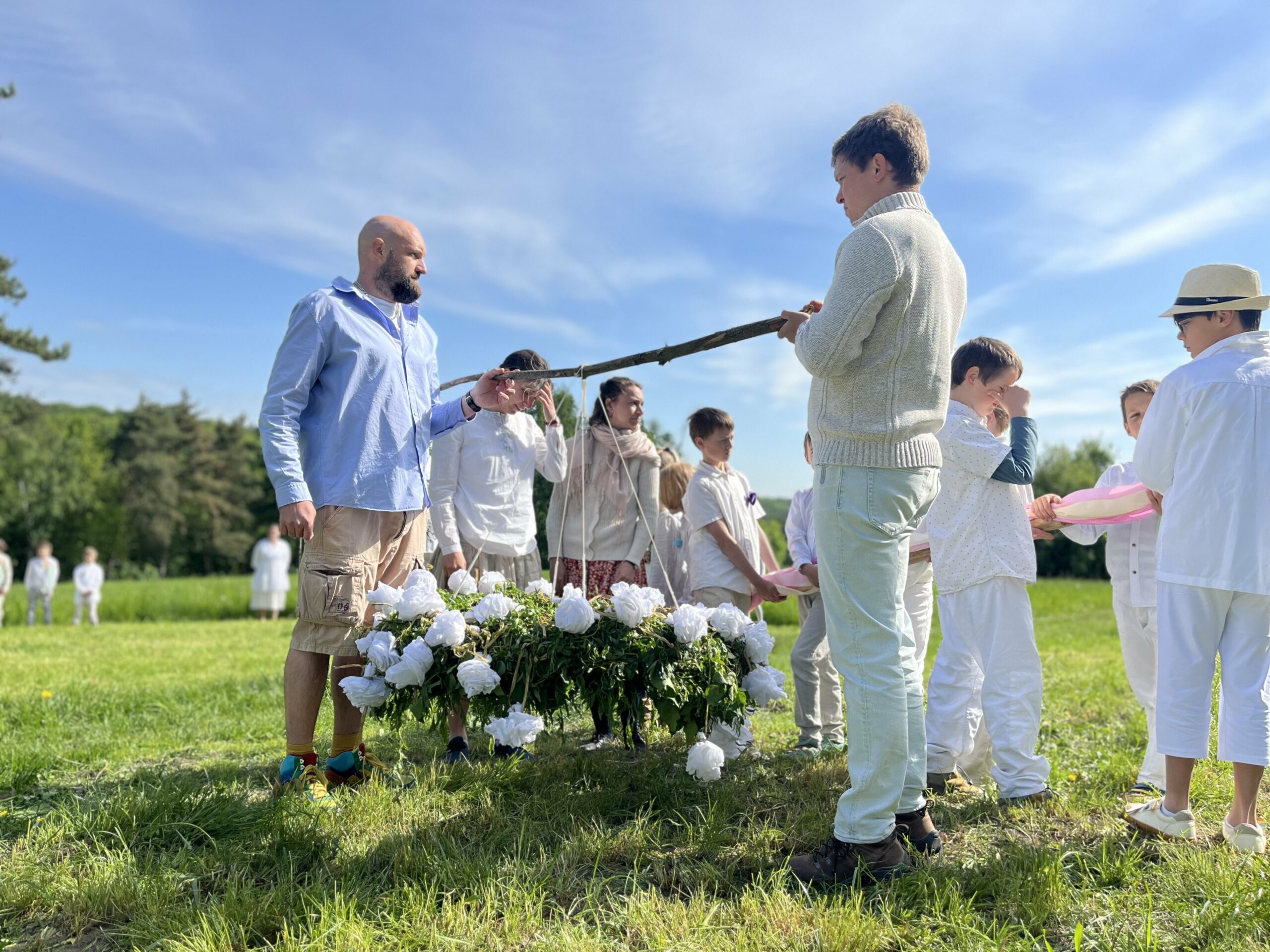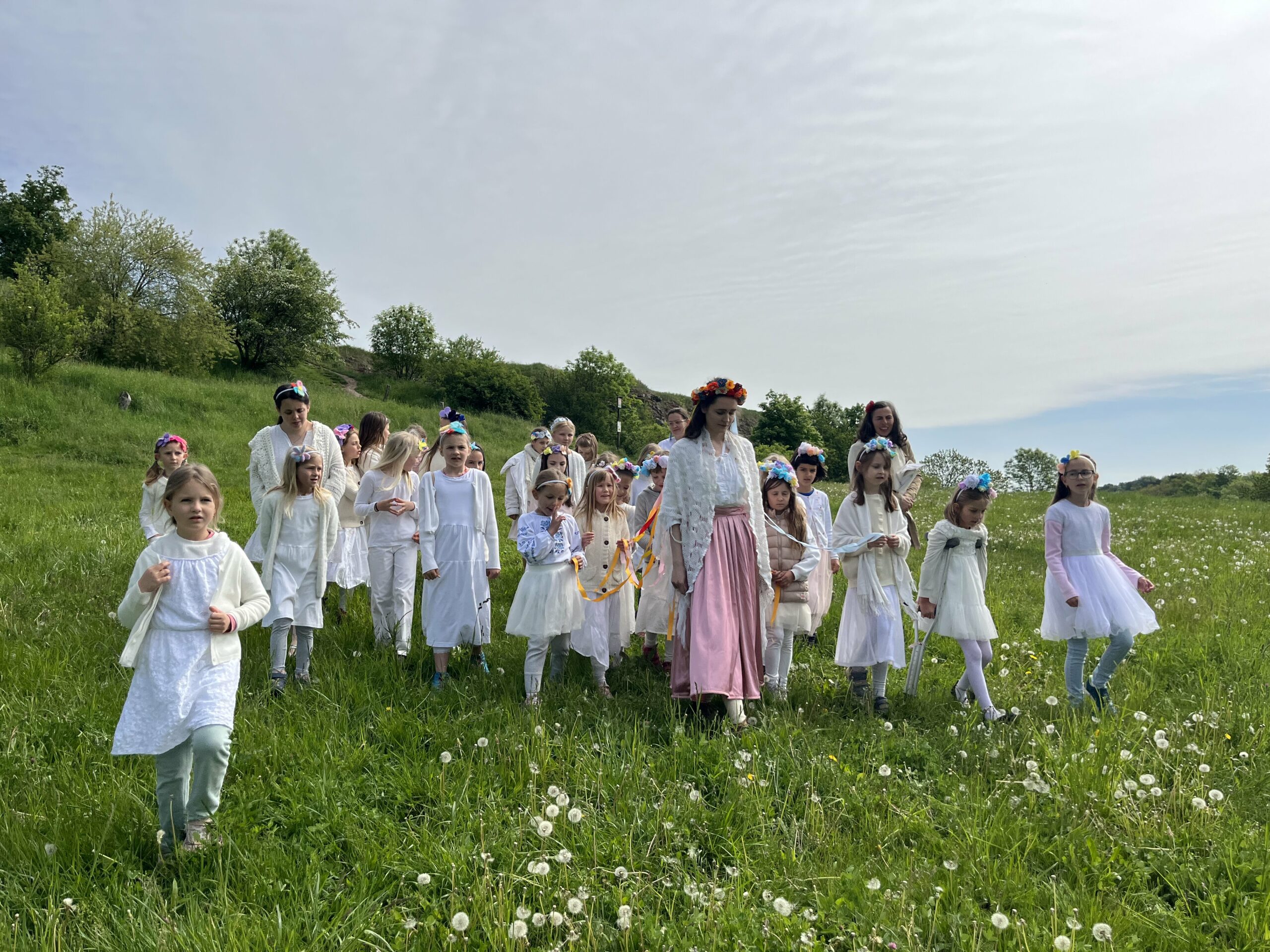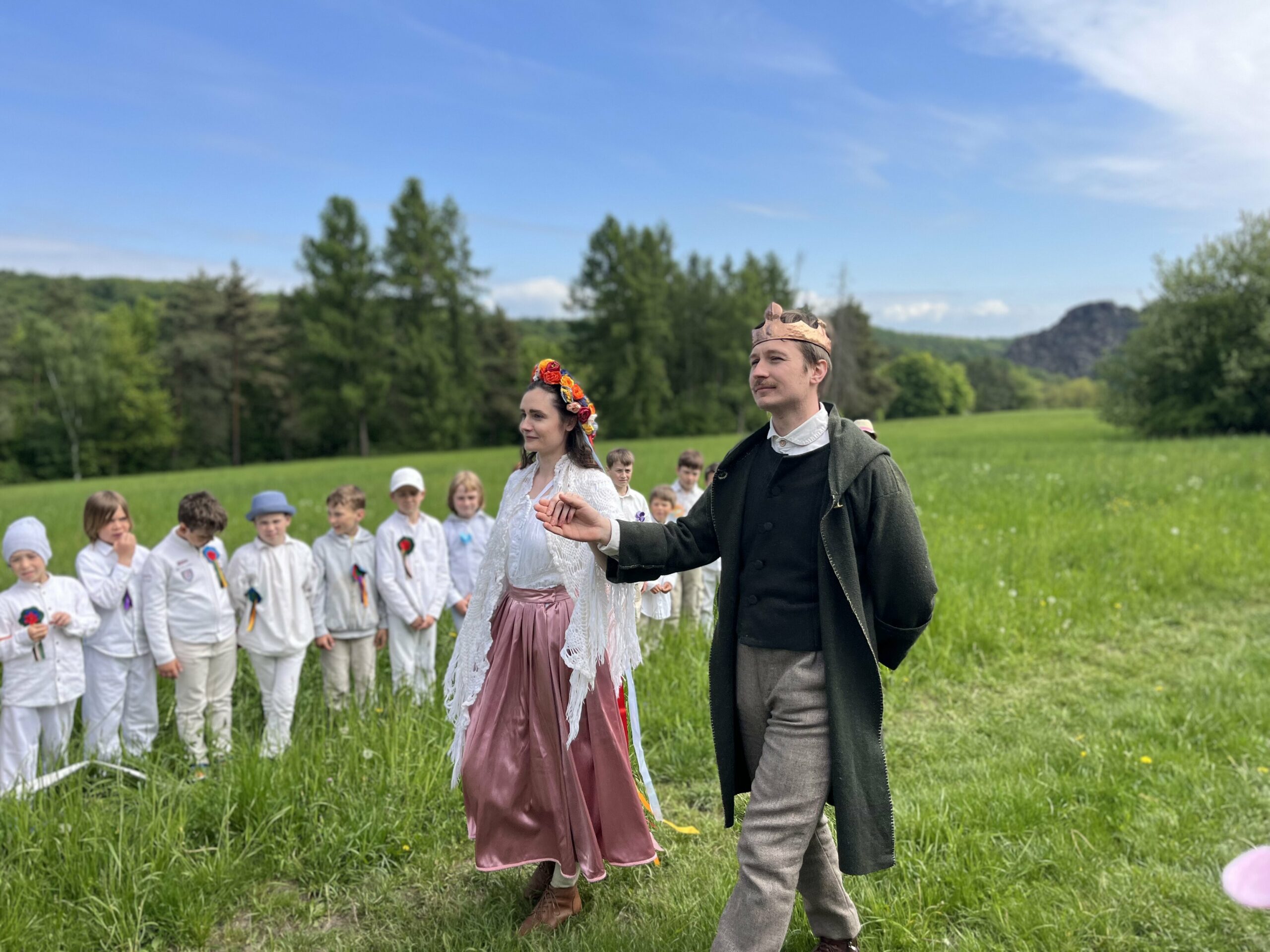 Společně jsme oslavili Letnice. Setkali jsme se na louce v pražské Šárce, chlapci v bílých košilích a dívky v bílých šatech. Děti zdobily věnce květy a papírovými holubičkami, tančily prastarou hru Na rytířstvo a zaplétaly v tanci stuhy kolem kmene máje. Za zpěvu se pak vydaly hledat krále a královnu. Mladý pár nakonec doprovodily ke svatebnímu obřadu.